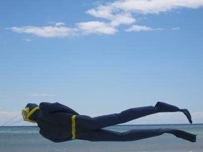 Steve got his skin-diver kite up but in the gusts the drogue lifted too much destabilizing the leg/flipper kicking arm moving diver. At least he was getting plenty of air! A drogue in the form of a jelly fish seemed to steady the diver.