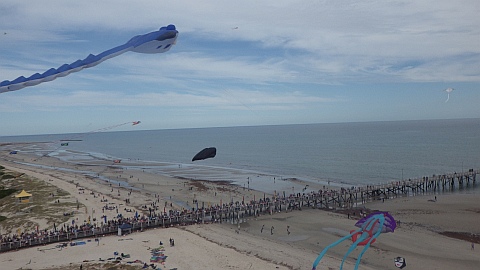 The photo was taken just before the official opening of flying for the day. See how packed the jetty is! At least 14 kites of widely varying size are already in the air.