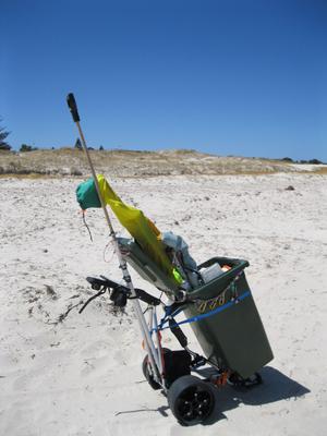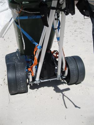After some previous challenges with the golf buggy converted for use carrying kites on and off the beach with a plastic bin I added a long handle bar at the back to help tip the buggy back onto its rear (doubled) wheels. For a rough and ready adaption performed on the Saturday (with the hardware store man shaking his head with that expression 'it aint going to work!') the contraption worked a treat!