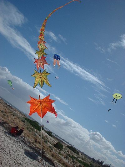 Realistic "leaves" in this Taiwanese kite trainDuring the 2007 event in Adelaide, a Taiwanese kite-master had been invited. He and some helpers put up several magnificent kite trains. The one shown was leaning over at a 45-degree angle in a very fresh southerly breeze. It stretched so far up that it was one of the very first things you noticed as you approached the beach. The flying line seemed to be made of traditional materials as well, and it was quite thick in order to cope with the combined pull of all those colorful kites.