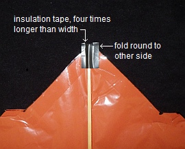 The pieces of electrical tape mentioned below should all be roughly four times longer than they are wide. You can't see the full length in the photos, since they are folded under.