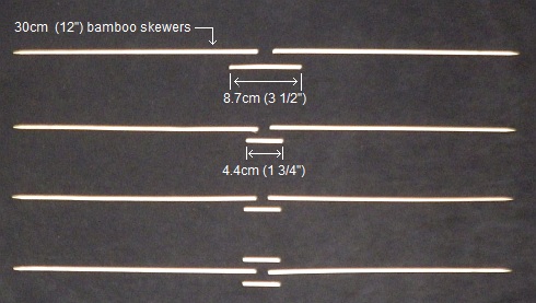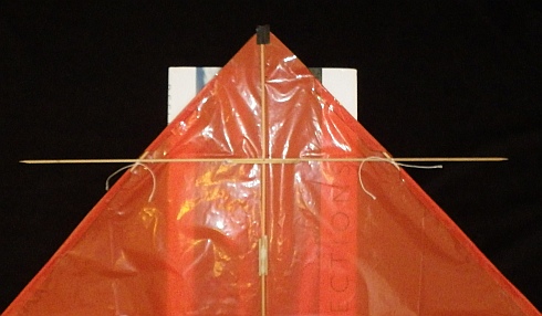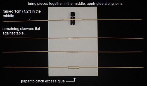 The remaining pair of skewers will form the spreader, which keeps the leading edges apart in flight. To keep the tips off the table or floor, you will need to place the kite on an object such as a book.