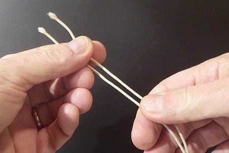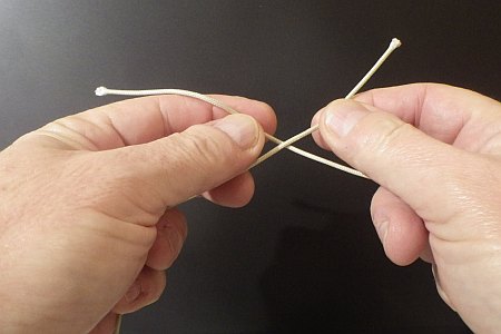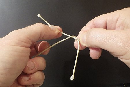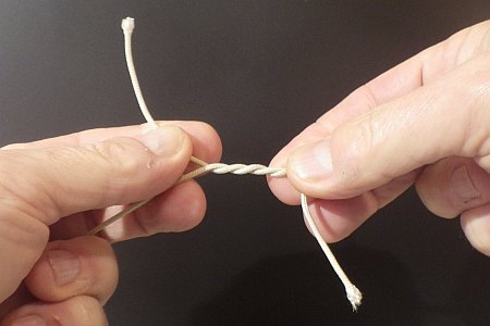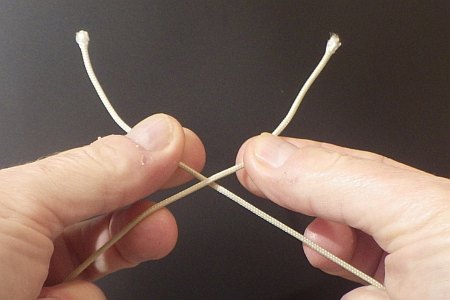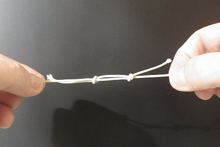 For simplicity, I have demonstrated a knot with just three turns on either side. However, if you add more turns, the strength can approach 100% of the line's unknotted breaking strain! Fishermen use up to eight turns, each way, on slippery fishing line. However, I think braided nylon or Dacron would achieve similar strength on just four or five turns each way.