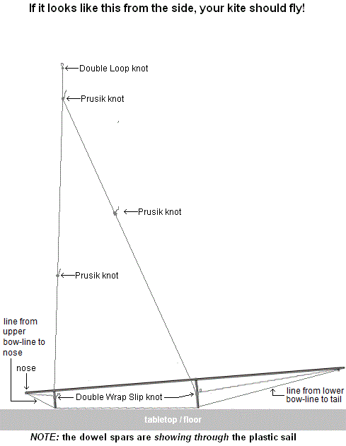 To keep the bowed horizontal spars from flopping back down to the sail, they need to be tethered with short loops of flying line. These can be seen in the diagram above, near the tabletop.