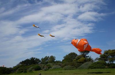 One day while I was flying my three 10 foot Bee kites in Berkeley, California when all of a sudden out of no were came this giant 36 foot Clownfish kite and started to chase the Bees. I thought that the fish was going to eat them! But I was wrong; it only wanted to play with them. And play they did all day long. We all had fun especially in Berkeley, California.