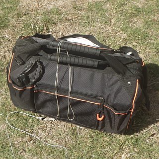 Tool-bag pin-downI do this a lot. For all but my heaviest-pulling kites, the tradesman's tool bag