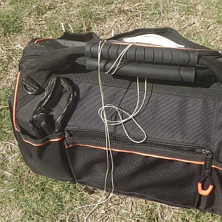 What if you can't find, or don't want to use, a bag with handles? In this case you can simply trap the line under the bag with the winder against the bag on the downwind side. For harder pulling kites, you would take a turn or two around the bag—over the top and under the bottom. Again, the winder should be up against the downwind side of the bag.
